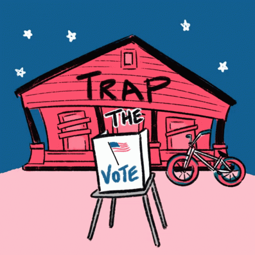 Cartoon art of the Pink Trap House with a 'Trap The Vote' ballot box, promoting voting in Atlanta, Georgia.