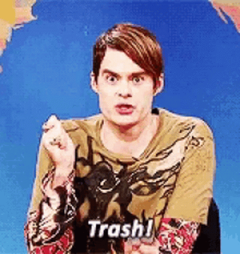 Bill Hader as Stefon from SNL emphatically declares 'Trash!' while sitting in front of a blue background.