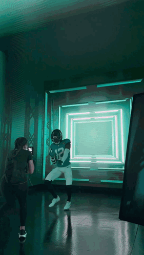 Travis Hunter, a Jacksonville Jaguars player, poses in his number 12 uniform in a vibrant green-lit studio.
