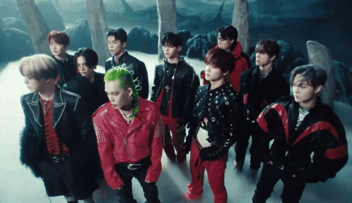 TREASURE members in a group shot, one with vibrant green hair, in a dark, stylized setting for their 'KINGKONG' concept.