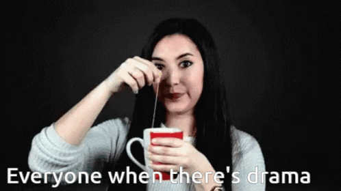 A woman sips tea, embodying the 'Everyone when there's drama' meme, ready to enjoy the spectacle.