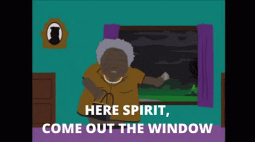 A South Park character calls out to a spirit from a window, offering '666 GNTL' in a humorous scene.