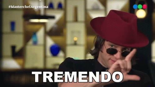 Joaquín Levinton, wearing a red hat and sunglasses, points as 'Tremendo' appears on Masterchef Argentina.