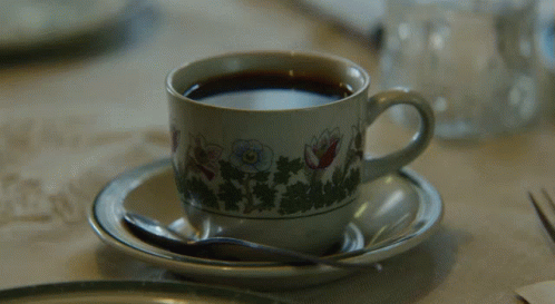 A floral coffee cup on a saucer, showing ripples on the surface from a tremor or shake.