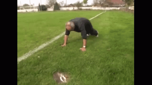 Trener Limeni Sklekovi performs push-ups on a grassy soccer field, demonstrating strength and fitness.