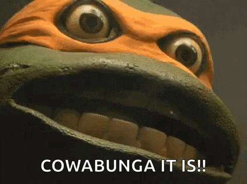 A close-up of a TMNT character, possibly Trigg, with its mouth open and the meme text 'COWABUNGA IT IS'.