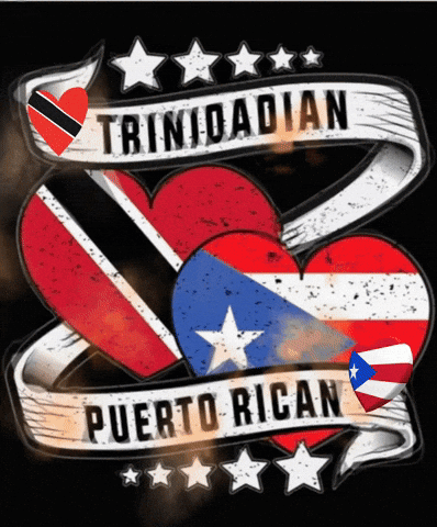 A graphic celebrating Trinidadian and Puerto Rican heritage with flags and hearts.