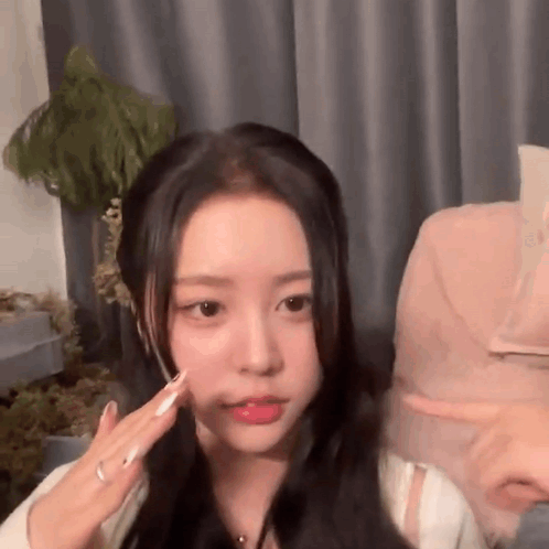 Hyerin from Triples posing for the camera, then looking down in a living room setting.