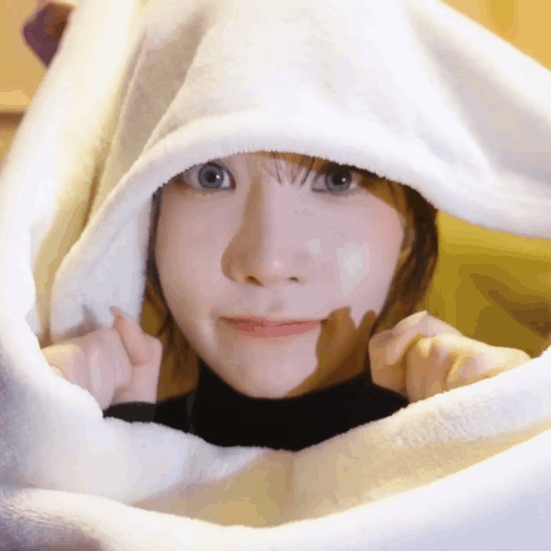 Triples' Nakyoung looks adorable in a white hooded blanket, making a cute expression for the camera.