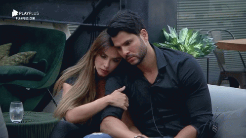 Nicole Bahls and her partner appear sad and upset, embracing on a couch during Power Couple Brasil.