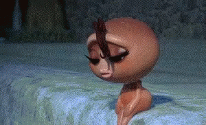 A cartoon character sits sadly with a bird on her head, looking dejected.