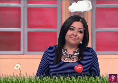 Alba's mood changes from sad to happy as animated rain falls, wearing a blue striped shirt and heart pin.
