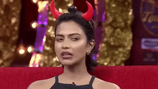 Woman with red hair playing a trumpet in a festive setting, performing 'Amor De Que'.