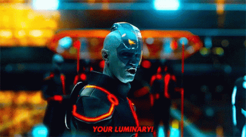 James Frain as Jarvis in Tron Legacy declares 'Your Luminary!' in a futuristic setting.