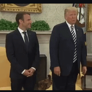 Donald Trump playfully brushes something off Emmanuel Macron's shoulder during a meeting in the Oval Office.