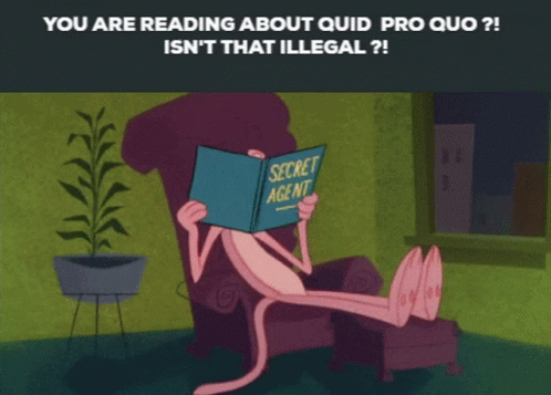 Pink Panther reads a 'Secret Agent' book, with text questioning 'quid pro quo' and its legality, referencing Trump impeachment.