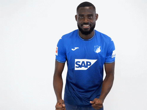 Kasim Adams, a TSG 1899 Hoffenheim player, smiles and flexes his fists in his blue SAP-sponsored jersey.