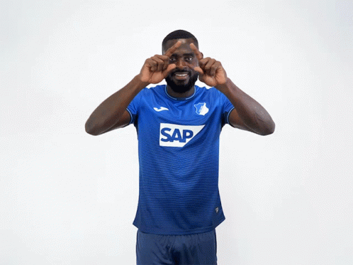 Kasim Adams, wearing a blue TSG Hoffenheim jersey with SAP logo, smiles and points upwards.