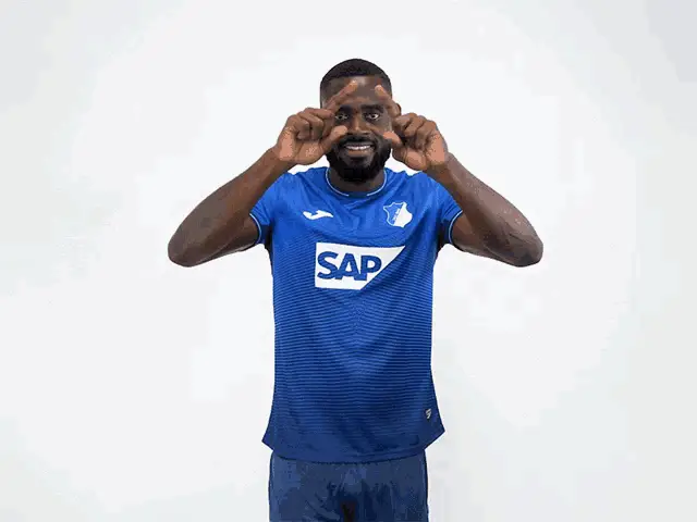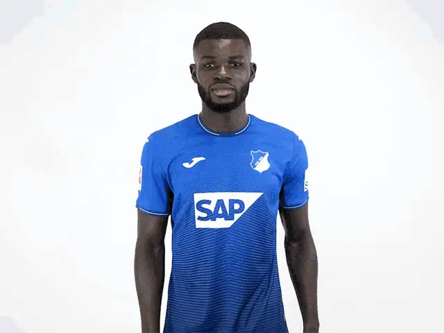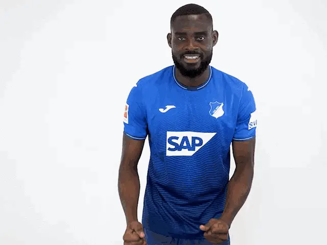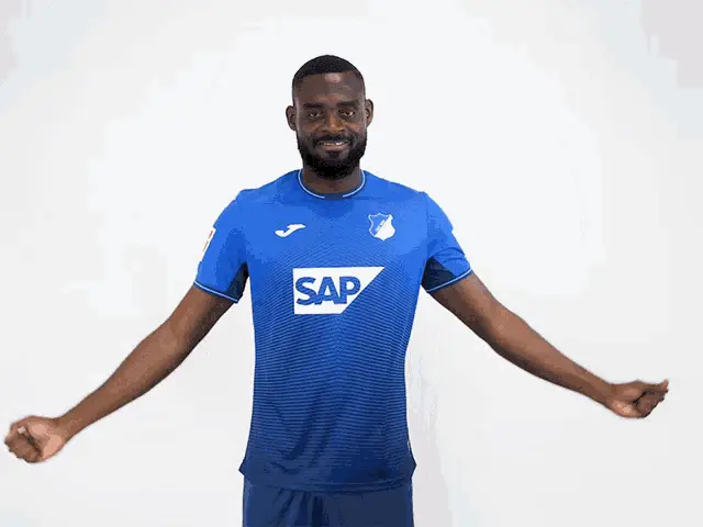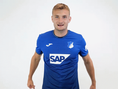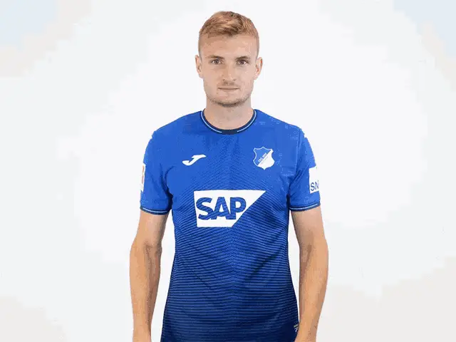 Stefan Posch, a footballer for TSG Hoffenheim, celebrates enthusiastically in his blue team jersey.