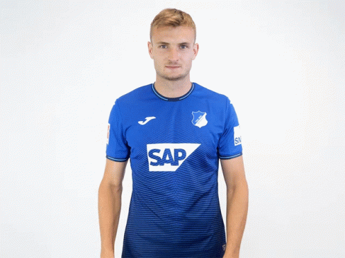 Stefan Posch, wearing his TSG 1899 Hoffenheim jersey, makes a gesture with his hands.