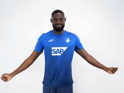 Ghanaian footballer Kasim Adams, a TSG Hoffenheim player, flexes his arms in his blue SAP-sponsored jersey.