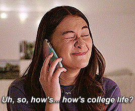 Belly Conklin (Lola Tung) on the phone, asking 'Uh, so, how's... how's college life?' from TSITP.