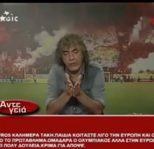 Greek sports commentator Tsoukalas delivers an animated and passionate commentary, discussing Olympiacos and European football.