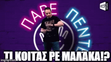 Tsouvelas asking 'Ti Koitas Re Malaka!?' (What are you looking at, asshole!?) in front of a neon sign.