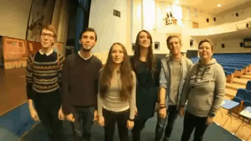 Three young women on stage, one making a "shush" gesture, wearing a Barbie shirt.