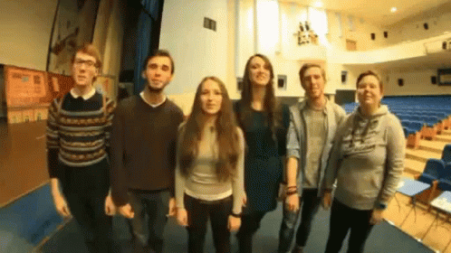 A group of six young adults in an auditorium make 'shhh' gestures, emphasizing silence and secrecy.