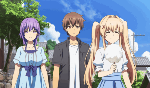 a boy and two girls are standing next to each other with one girl holding cotton candy