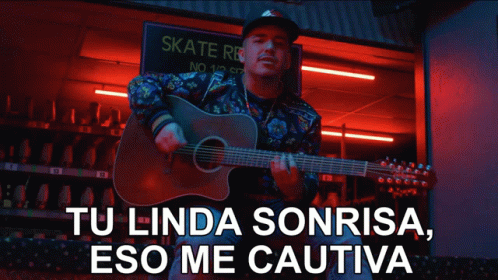 A man plays an acoustic guitar in a neon-lit setting, featuring the lyric 'Tu Linda Sonrisa Eso Me Cautiva'.