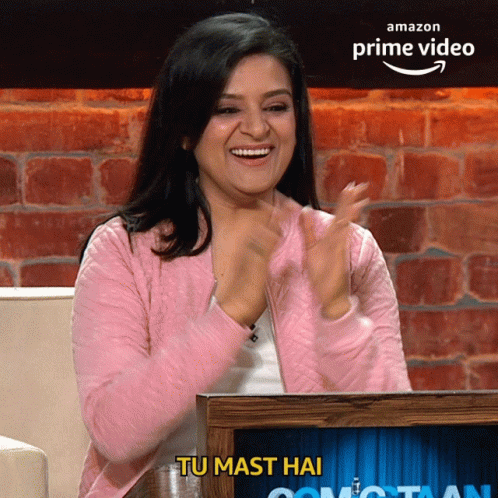 Woman from Comicstaan enthusiastically gestures 'okay' with both hands, captioned 'Tu Mast Hai'.