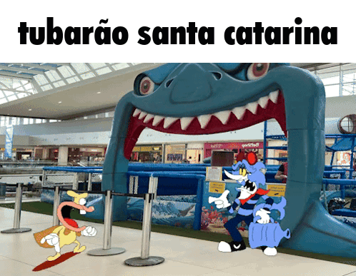 Cartoon characters interact with a giant inflatable shark at a mall, featuring 'Tubarão Santa Catarina' text.