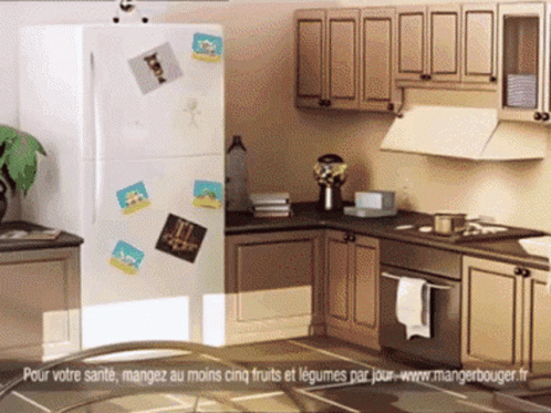 Animated Petits Filous Tubs characters in a refrigerator, featuring a banana peel gag and health messages.