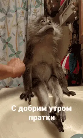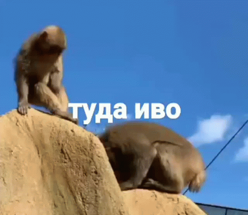 Two monkeys playfully moving on a rock under a clear blue sky, with Russian text overlaid.