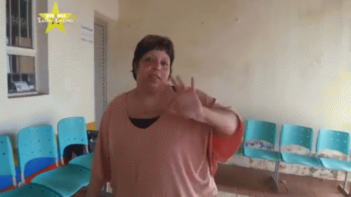 Tulla Luana, the web diva, stands in a room with blue chairs, wearing a pink shirt, ready to greet her audience.