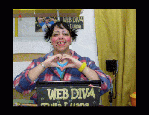 Tulla Luana, the Web Diva, makes kissing gestures, thumbs up, and a heart shape for the camera.