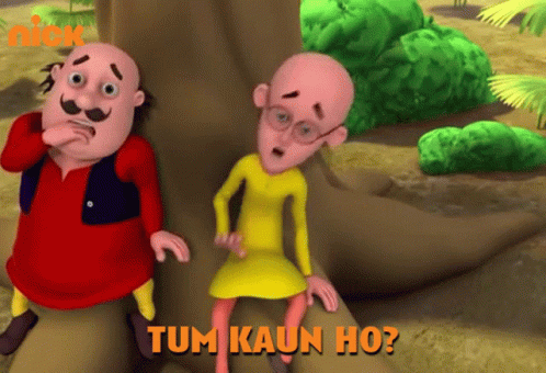 Motu and Patlu sit together as the question 'Tum Kaun Ho?' (Who Are You?) appears on screen.
