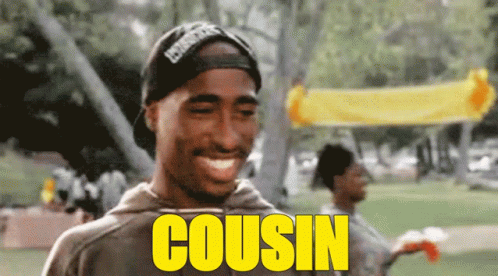 Tupac Shakur smiles with 'COUSIN' text, followed by Kanye West's expressive reactions.