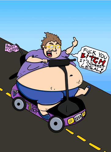 a cartoon of a fat man riding a scooter with a sign that says boxy is queen
