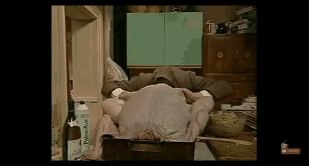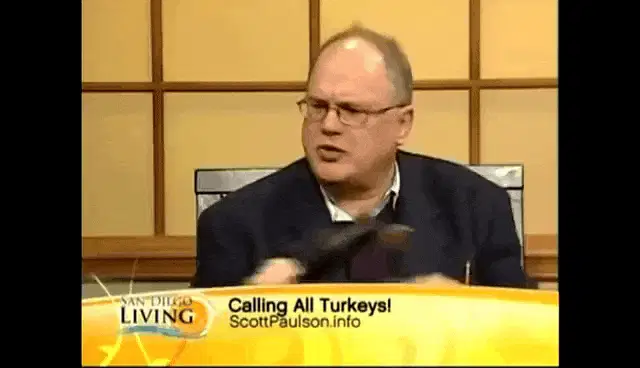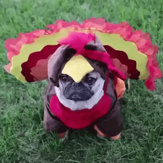 Man in a turkey costume wishes everyone a Happy Thanksgiving with a cheerful expression.