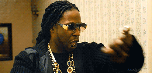 Man with dreadlocks, sunglasses, and gold grillz making hand gestures, looking 'turnt up'.