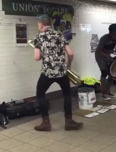 A man with green hair energetically plays a baritone saxophone in the Union Square subway station.