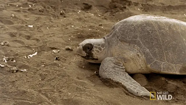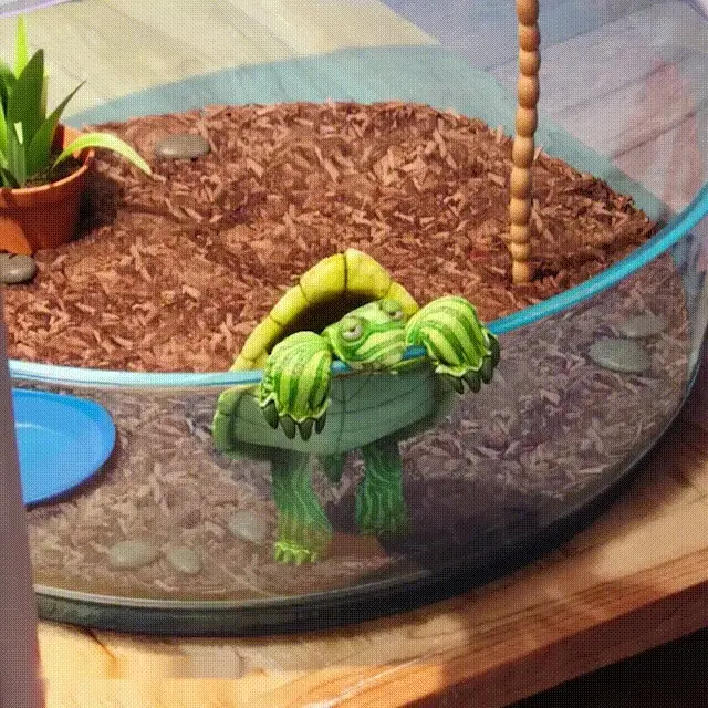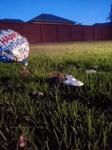 Adorable turtle slowly walks on grass near a partially deflated Happy Birthday balloon in an outdoor setting.