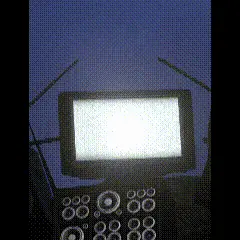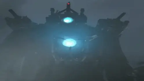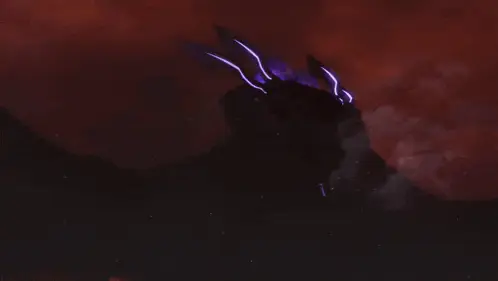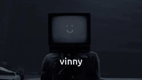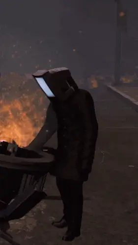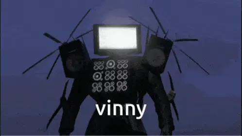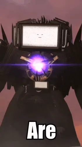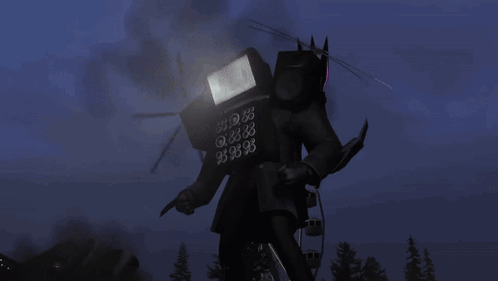 Tvman from Skibidi Toilet stands in the dark, his screen head glowing intensely with a red light.