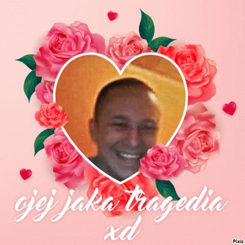 Man's face in a heart frame with roses and the Polish caption "ojej jaka tragedia xd".