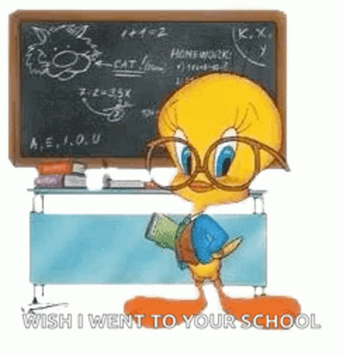 Tweety Bird, wearing glasses and a blue jacket, winks in front of a blackboard with the text 'Wish I Went To Your School'.