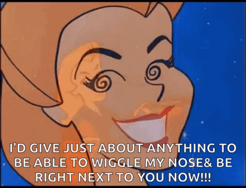 An animated character from Bewitched smiles, wishing she could wiggle her nose to be next to you.