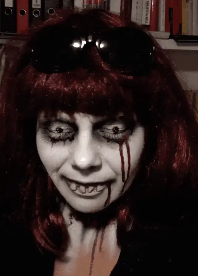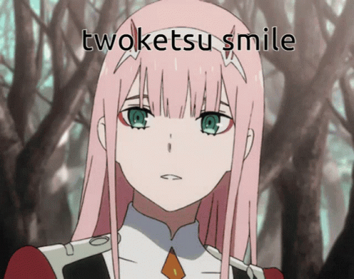 Zero Two from Darling in the Franxx displays the iconic 'twoketsu smile' in this anime image.